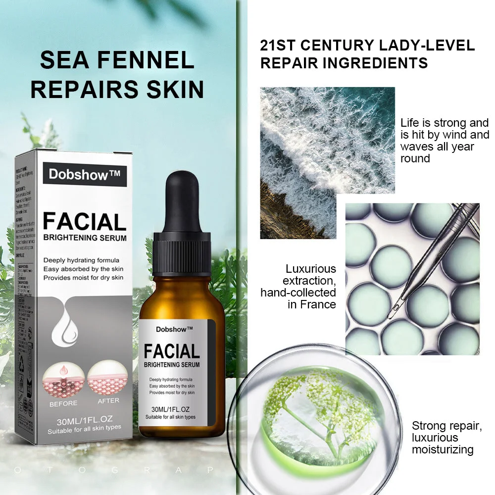 Dobshow™ Melanin Correcting Facial Serum Contains special Sea fennel(Crithmum maritimum) ,also known as sea rock cress, is a plant that grows along the coastline, and its extract has a variety of skincare benefits. Rich in vitamin C and antioxidants, sea fennel extract can effectively inhibit tyrosinase activity and reduce melanin production, thus fading pigmentation, whitening and even skin tone. Its good moisturizing effect can help the skin retain moisture, improve dryness and make the skin soft and smooth. In addition, sea fennel extract is rich in minerals and trace elements, repairing the damaged skin barrier, promoting cell regeneration, reducing inflammation, alleviating redness and sensitivity, and making the skin healthier and more stable!