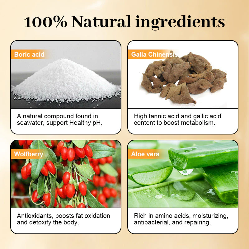FemiPure™ contains 600 mg of doctor-recommended boric acid sourced from Turkey, renowned for its quality and purity. It supports a healthy pH and effectively treats vaginal infections. Additionally, Galla Chinensis, enriched with tannic acid and gallic acid, promotes metabolism, reduces fat absorption, controls appetite, and supports digestion for effective weight loss.