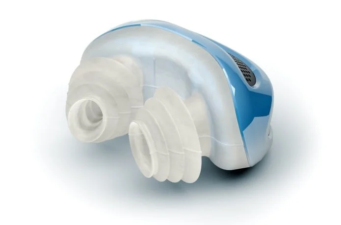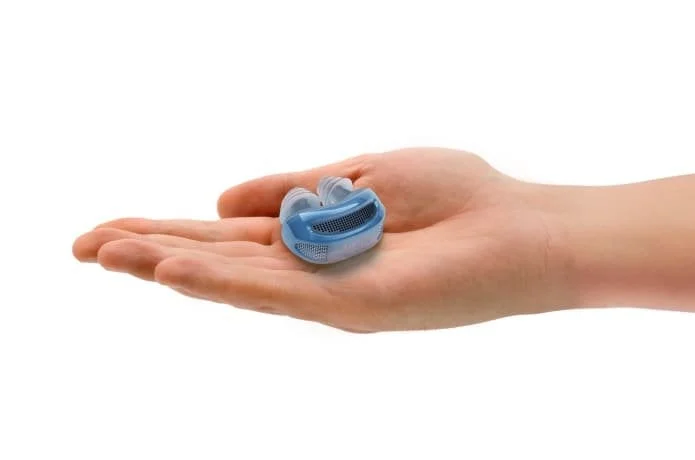 Airing’s design is a combination of several inventions, chief of which are the micro-blowers originally intended for heat regulation for chips in computers. These micro-blowers are entirely contained within the Airing device, so there is no need for external air hoses. Each Airing device is battery operated, so no need for any power wires. Just “plug” the comfortable buds into your nostrils and breathe all night long.