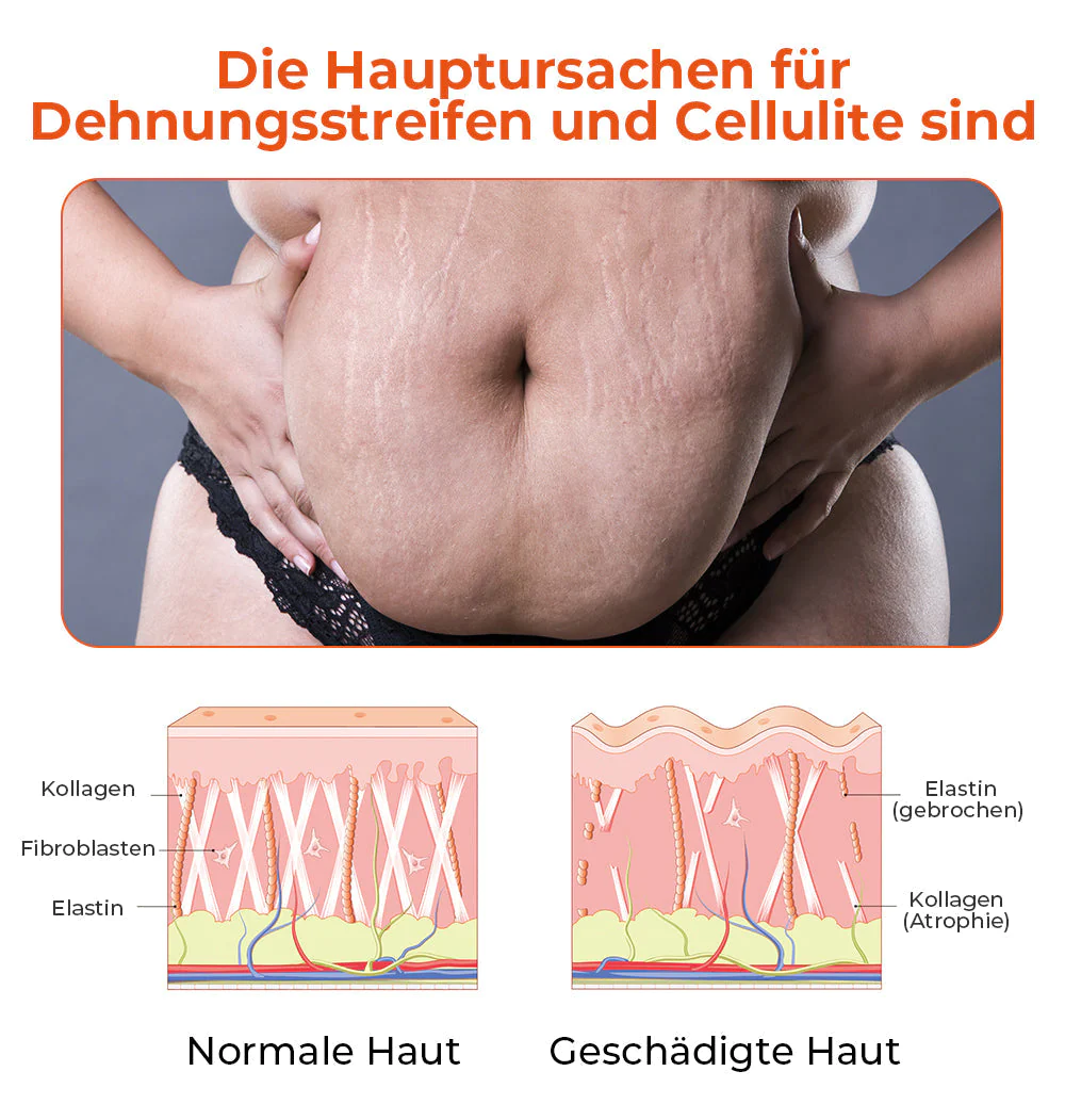 Dehnungsstreifen und Cellulite werden hauptsächlich durch den Abbau des elastischen Gewebes der Haut verursacht. Die Haut besteht aus mehreren Gewebeschichten, darunter Kollagen- und Elastinfasern, die der Haut ihre Elastizität und Festigkeit verleihen.
