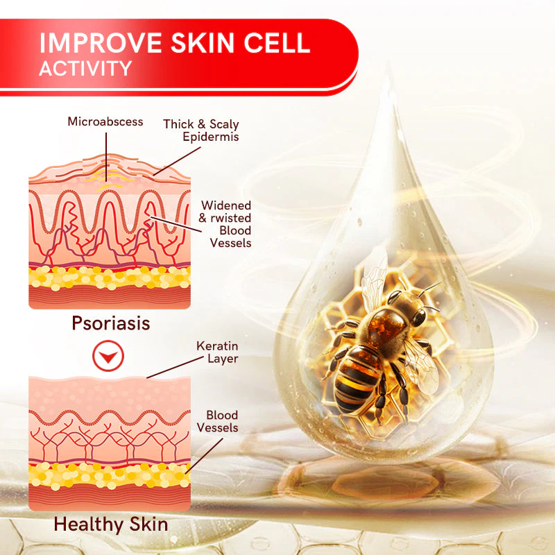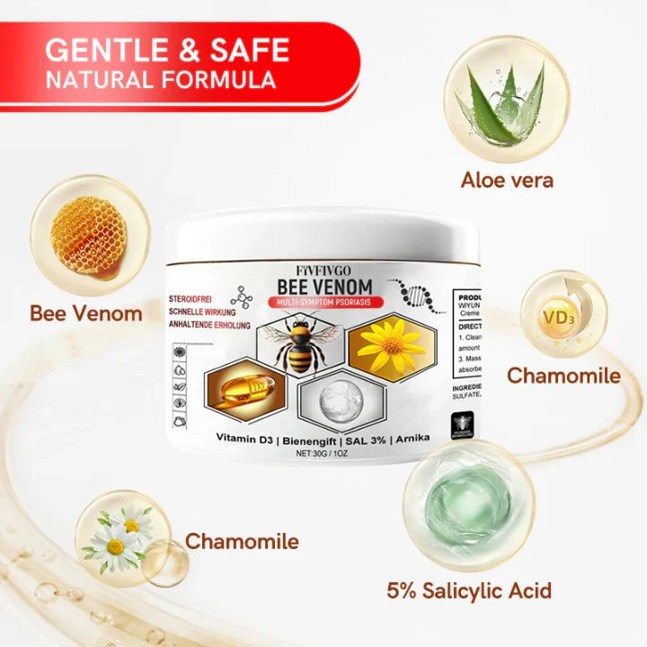 Fivfivgo™ Bee Venom Multi-Symptom Psoriasis Cream cleanses the skin from the inside out, alleviating itching and inflammation. It is free from irritating chemicals and does not exacerbate already damaged skin. Fivfivgo™ helps minimize the growth of skin cells triggered by psoriasis, providing relief from inflammation, itching, and scaling associated with this condition.