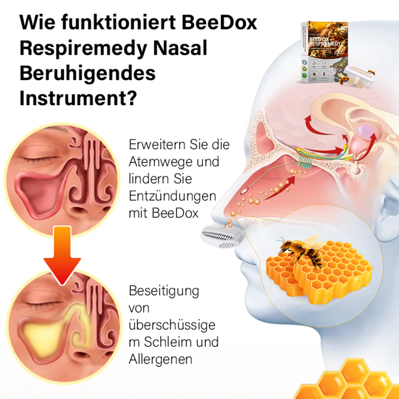 Eine Nebenhöhlenentzündung kann zu Verstopfungen und Blockaden führen, die den normalen Abfluss des Schleims behindern und zu Beschwerden führen. Das BeeDox Respiremedy Nasal Soothing Instrument hilft, den Schleim zu lösen und ermöglicht so eine gründlichere Reinigung der Nebenhöhlen. Indem dieses Gerät verschiedene Probleme im Zusammenhang mit der Gesundheit und Funktion der Nebenhöhlen behandelt, kann es zu einer Verbesserung der allgemeinen Atemgesundheit und einer Verringerung der Nebenhöhlenbeschwerden führen und so letztendlich zu einem angenehmeren Atemerlebnis beitragen.