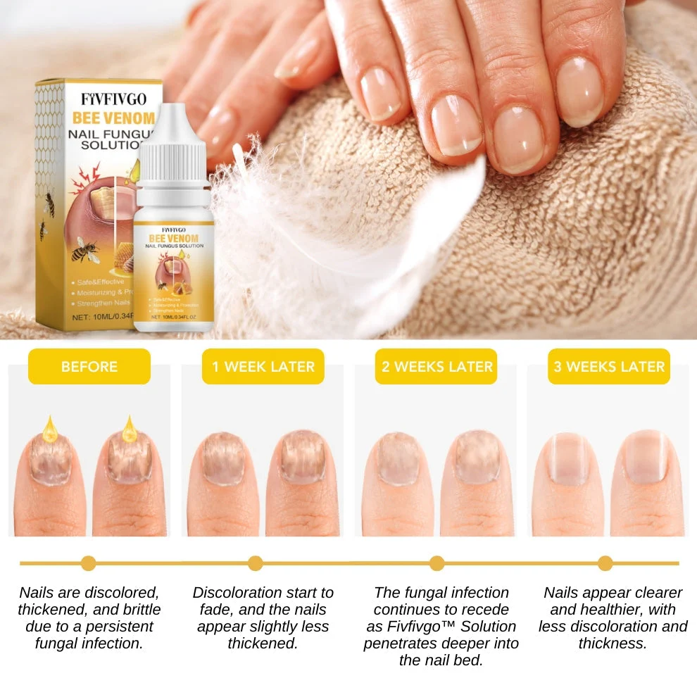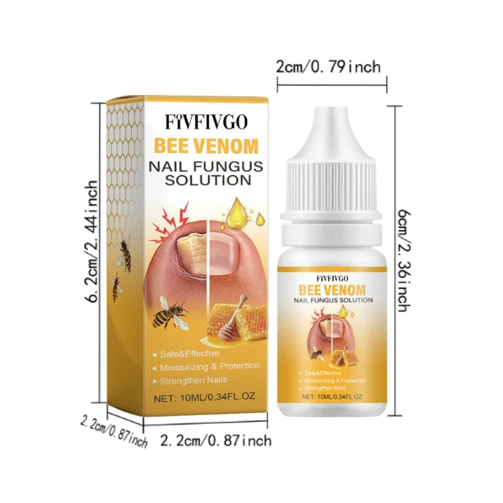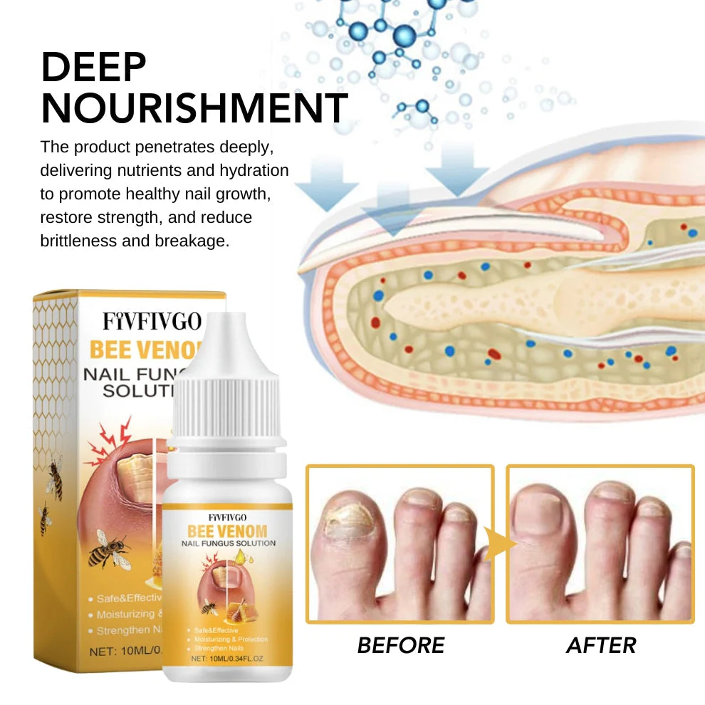 Die Fivfivgo™ BeeVenom Nagelpilz Lösung wirkt durch die Kombination leistungsstarker natürlicher Inhaltsstoffe zur Bekämpfung von Nagelpilz und zur Förderung der Nagelgesundheit. Bienengift stimuliert die Mikrozirkulation um die Nägel herum und verbessert ihre Gesundheit und Fähigkeit, Pilzinfektionen zu widerstehen. Die Lösung bildet eine Schutzschicht auf der Nageloberfläche, die einen dauerhaften Schutz gegen äußere Schäden bietet und den Nagel tiefgreifend nährt, um seine Festigkeit und Textur zu verbessern und so für gesündere und widerstandsfähigere Nägel zu sorgen.