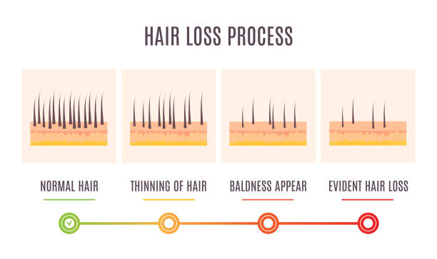 Hair loss process infographic of scalp close up with receding hair follicles. Skin cross-section medical diagnostics diagram. Alopecia treatment and transplantation concept. Vector illustration.
