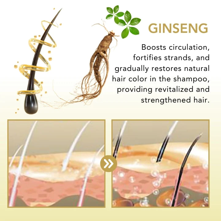 Ginseng – verbessert die Durchblutung und liefert lebenswichtige Nährstoffe an die Haarwurzeln, wodurch eine optimale Umgebung für die Pigmentierung geschaffen wird. Die starken Antioxidantien im Ginseng, insbesondere Ginsenoside, stärken die Stränge und verhindern vorzeitiges Ergrauen. Dies führt zu einer allmählichen Wiederherstellung der natürlichen Haarfarbe, wodurch die Benutzer im Laufe der Zeit revitalisiertes und gestärktes Haar erhalten.