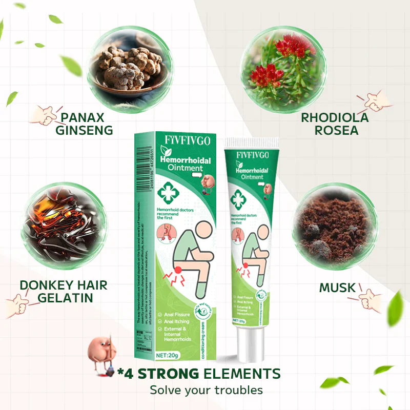 Haben Sie mit Beschwerden aufgrund von Erkrankungen wie Verstopfung, Hämorrhoiden, entzündetem oder vorgefallenem Hämorrhoidalgewebe, Analfissuren, Analwarzen, Analekzemen oder anderen damit verbundenen Beschwerden zu kämpfen? Unsere Fivfivgo™ Hämorrhoidalsalbe bietet starke Unterstützung. Unsere Formel wurde speziell entwickelt, um die Gesundheit des Verdauungssystems zu fördern, Hämorrhoiden zu lindern und Analstörungen vorzubeugen.