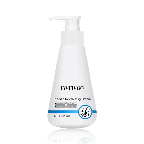 Fivfivgo™ Keratin Revitalisierende Creme wirkt, indem sie Keratin und pflegende Inhaltsstoffe in das Haar einschleust. Sie hilft, Spliss zu reparieren, indem sie die geschädigten Haarfasern bindet, spendet trockenem Haar Feuchtigkeit, um es wieder mit Feuchtigkeit zu versorgen, verleiht stumpfem Haar Glanz und glättet Frizz, indem sie eine Schutzbarriere bildet. Darüber hinaus kann das Keratin in der Formel zu einer Glättung beitragen, indem es die Haarstruktur vorübergehend entspannt und für ein geschmeidigeres Aussehen sorgt. Diese Creme trägt zur allgemeinen Gesundheit des Haares bei und macht es glatter, lebendiger und weniger anfällig für häufige Probleme wie Spliss, Trockenheit, Stumpfheit und Kräuseln.