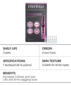 Fivfivgo™ Breast Enhancement Lift Ampoules Oil hat das Potenzial, die Kapazität bestehender Zellen, die Lipide speichern können, zu erhöhen und gleichzeitig die Bildung neuer Zellen zu beschleunigen , die dies können, sodass Zellen, die mehr Lipide speichern können, das Wachstum von Geweben wie der Brust fördern.