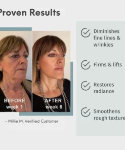 „Ich habe noch nie ein so effektives Serum verwendet. Dieses Bild wurde kurz nach 5- wöchiger Verwendung aufgenommen !!! Ich kann den Unterschied zu meinen 20 Jahre jüngeren Freunden nicht feststellen. Es ist wie der Jungbrunnen lol! Die Transformation zu meiner Haut war sofort. Es wurde zuerst von der Kosmetikerin in meiner Dermatologenpraxis eingeführt, und ich mag die Art und Weise, wie dieses Serum meine Haut zum Leben erweckt, meiner Haut einen sichtbaren „Lift“ verleiht, ohne fettig zu sein. Ich werde es weiterhin verwenden, um meine Haut wieder in einen jugendlicheren Zustand zu versetzen!”