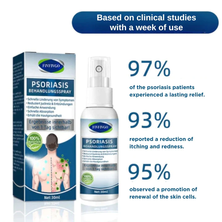 Fivfivgo™ Psoriasis Treatment Spray cleans the skin from the inside out and relieves itching and inflammation. It contains no irritating chemicals and does not aggravate already damaged skin. Fivfivgo™ helps minimize the growth of skin cells triggered by psoriasis and provides relief from the inflammation, itching and scaling associated with this disease.