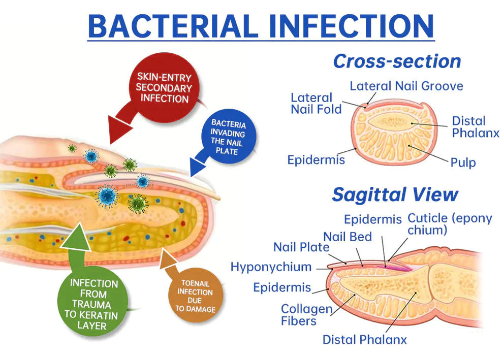 Die Blaulichttherapie ist ein medizinisches Verfahren, bei dem blaues Licht mit einer spezifischen Wellenlänge von 470 nm zur Nagelbehandlung eingesetzt wird. Es kann die äußere Schicht des Nagels durchdringen und eine photodynamische Reaktion im Keratin des Nagels auslösen. Diese Reaktion führt zur Bildung von schädlichen freien Sauerstoffradikalen, die Bakterien und Pilze in der Nähe des Nagels wirksam bekämpfen und zerstören können, wodurch entzündungsbedingte Infektionen reduziert und Symptome wie Rötung, Wärme und Schmerzen an der Entzündungsstelle gelindert werden. Wichtig ist, dass es die grundlegende Reparatur von Schäden erleichtern kann, ohne Nebenwirkungen oder Arzneimittelresistenz zu verursachen.