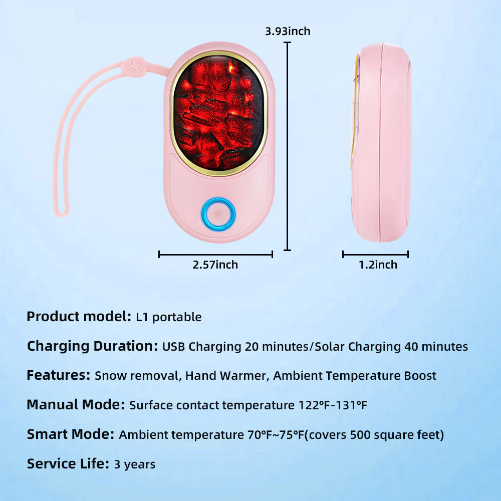 Da die Fivfivgo™ Solare elektromagnetische Resonanz Schneefeger-Heizung tragbar ist, können wir sie in unsere Taschen stecken und im Winter mitnehmen. Sie hält Ihre Körpertemperatur jederzeit aufrecht, so dass Sie nicht in dicke Kleidung schlüpfen müssen, wenn Ihnen nicht kalt ist. Wenn Sie den Knopf drücken, schaltet er in den manuellen Modus, und die Kontakttemperatur an der Oberfläche kann 122℉-131℉ erreichen, um den Körper gezielt zu erwärmen. Der Vorteil gegenüber Handwärmern ist, dass die Wärme nicht nur lokal auf der Oberseite des Gehäuses erzeugt wird. Der elektromagnetische Resonanzwärmeeffekt im manuellen Modus kann den gesamten menschlichen Körperbereich abdecken, so dass sich der ganze Körper angenehm warm anfühlt. Der Stromverbrauch ist so gering, dass das Gerät einen Monat lang mit einer einzigen Ladung betrieben werden kann.