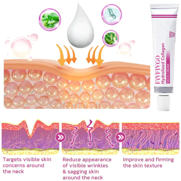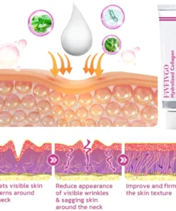 Die auf die Haut aufgetragene Fivfivgo™ Spain NECKPON Hydrolized Collagen Neck Cream produziert Kollagen, ein Prozess , der für die Straffung der Gesichtshaut, das Anheben und Straffen des Halses und das Reduzieren des Auftretens von Falten unerlässlich ist. Es hilft, den Hautdruck aufzuhellen und zu lindern, hilft, gestresste Haut zu klären, auszugleichen und zu entgiften, nährt, um eine klare, jugendlich aussehende Haut zu unterstützen.