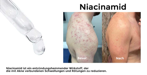 Niacinamid – Auch bekannt als Vitamin B3, ist ein wirksamer Bestandteil in der Behandlung von Akne am Rücken. Es reguliert die Talgproduktion, reduziert Entzündungen, verbessert die Barrierefunktion der Haut und hat antimikrobielle Eigenschaften. Durch die Kontrolle der Fettigkeit, die Beruhigung von Rötungen, die Förderung der Hydratation und die Hemmung von Akne verursachenden Bakterien trägt Niacinamid zu einer klareren und gesünderen Haut auf dem Rücken bei.