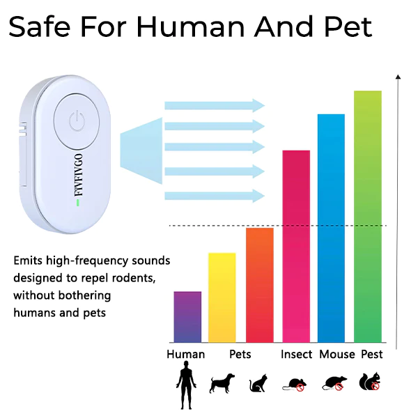 Sicher für Menschen und Haustiere: Fivfivgo™ legt großen Wert auf Sicherheit. Das Gerät ist so konstruiert, dass es für Menschen und Haustiere ungefährlich ist und gleichzeitig eine hervorragende Barriere gegen Schädlinge darstellt. Schaffen Sie eine sichere Umgebung für Ihre Lieben, ohne deren Wohlbefinden zu gefährden.