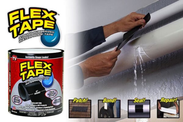 This durable adhesive tape instantly seals water, air and moisture to create a super strong, flexible, waterproof barrier. Unlike other tapes available, Flex Tape’s bond will increase with time and pressure.