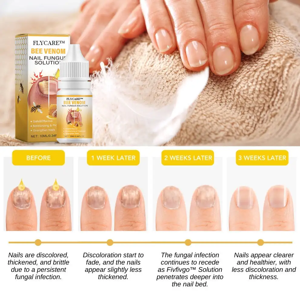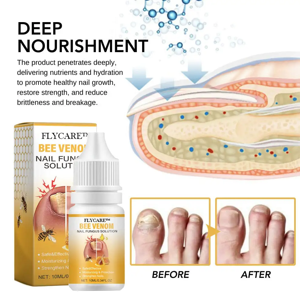The FLYCARE™ BeeVenom Nail Fungus Solution operates by blending potent natural components to fight nail fungus and support nail wellness. Bee venom enhances microcirculation around the nails, improving their health and capacity to fend off fungal infections. The solution establishes a protective layer on the nail surface, providing long-lasting defense against external harm while deeply nourishing the nail to bolster its strength and texture, ensuring nails that are healthier and more resilient.