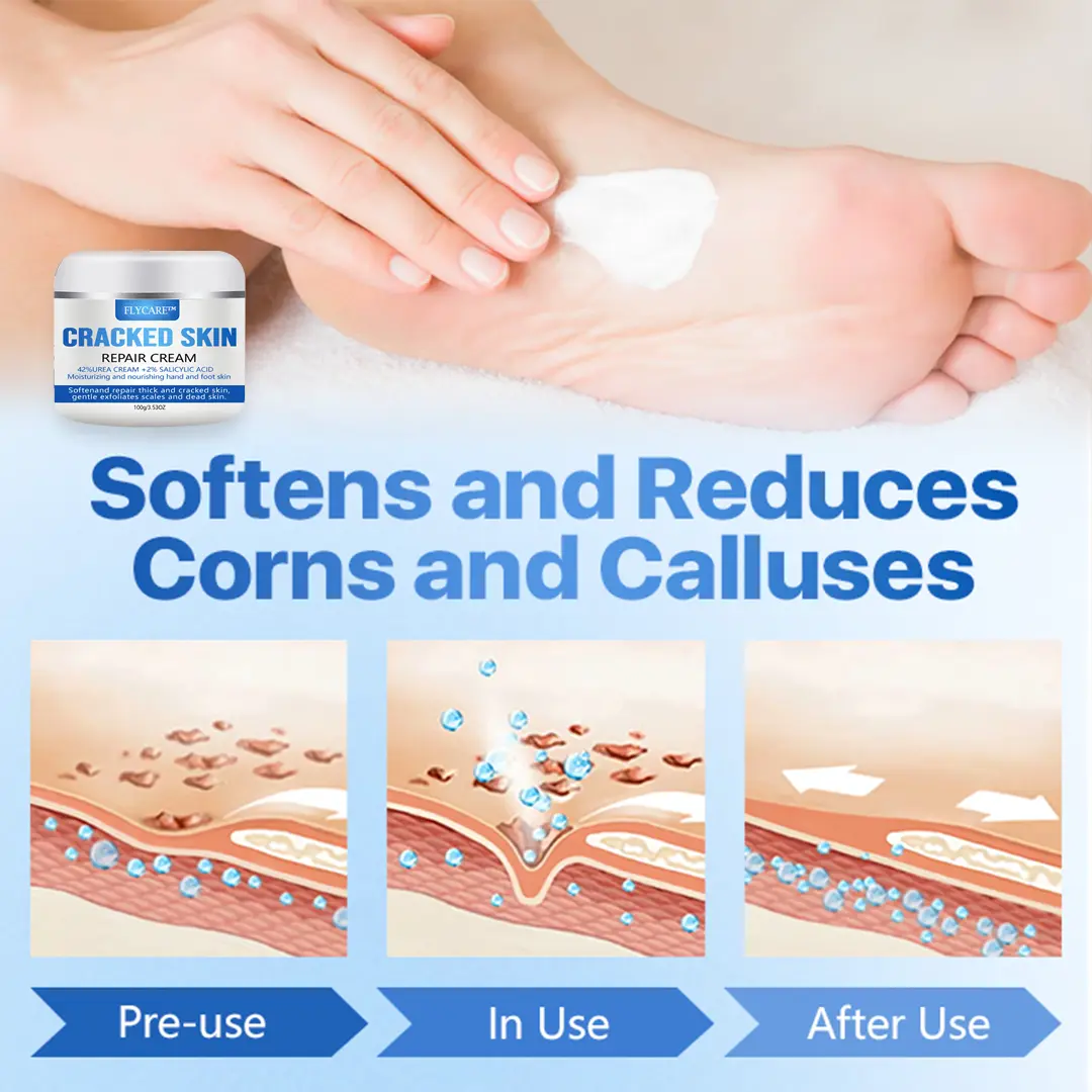 The Cracked Skin Repair Cream penetrates hardened skin layers, softening and diminishing the thickness of corns and calluses, facilitating their easier removal. This deep penetration ensures that even the most stubborn areas receive adequate treatment, promoting smoother and more flexible skin. Users will experience a significant improvement in skin texture and a reduction in painful calluses over time.