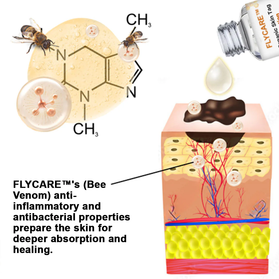 When FLYCARE™, our revolutionary skincare solution, is meticulously applied to the affected area, its powerful active ingredients, including melittin, apamin, and phospholipase A2, embark on a remarkable journey of skin transformation. These exceptional components possess a unique ability to deeply penetrate the skin’s surface, paving the way for a host of rejuvenating benefits.