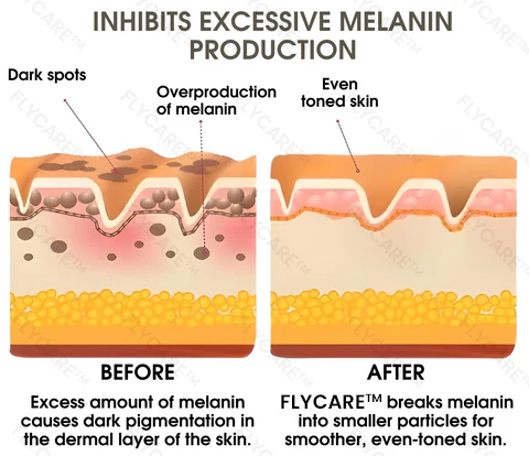 These agents diligently thwart excessive melanin production, the primary culprit behind uneven skin tone. With each application, FLYCARE™ actively combats hyperpigmentation, progressively unveiling a brighter, more uniform complexio