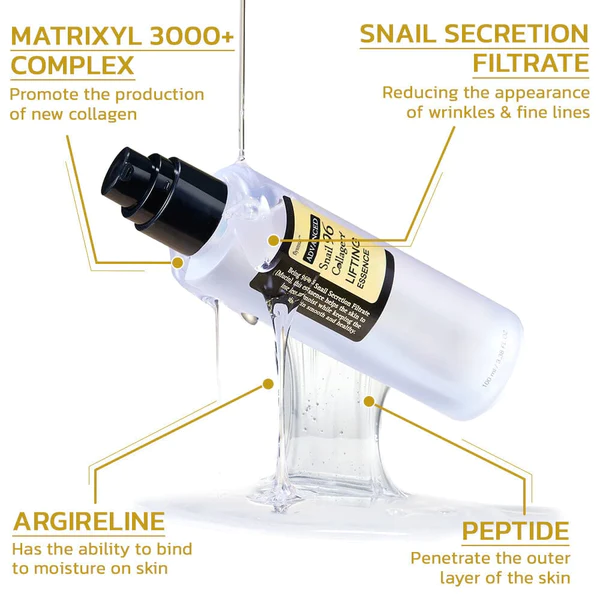 The flysmus™ Advanced Snail96 Collagen Lifting Essence represents a newly developed anti-aging remedy designed to combat the issues associated with wrinkles and fine lines. This product boasts generous quantities of snail collagen and the Matrixyl 3000+ Complex, working in harmony to diminish the appearance of wrinkles and provide the skin with a rejuvenated, firm, and velvety texture. Consistent application of this cream can effectively rejuvenate your skin’s radiance and restore a more luminous complexion.