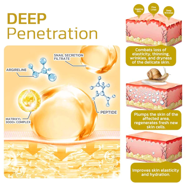 A premium sheet coated with Hydrogel and containing 5,000ppm of Snail Secretion Filtrate (SSF) is manufactured in Korea. SSF is naturally abundant in collagen, elastin, allantoin, and glucuronic acid, which can help replenish collagen, boost cell metabolism and regeneration, repair damaged skin tissue, reduce wrinkles and scars, and protect the skin from damage caused by free radicals.