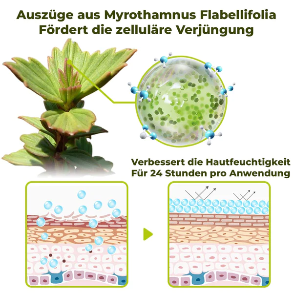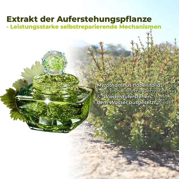 Myrothamnus flabellifolia, gemeinhin als “Auferstehungspflanze” bekannt, ist eine im südlichen Afrika beheimatete Pflanze. Sie ist bekannt für ihre Fähigkeit, extreme Dehydrierung zu überleben und dann wieder “aufzuerstehen”, wenn sie wieder Wasser ausgesetzt wird. In der Hautpflege werden Extrakte aus Myrothamnus flabellifolia wegen ihrer starken feuchtigkeitsspeichernden Wirkung verwendet. Dank einer bahnbrechenden Entdeckung, die durch umfangreiche klinische Studien gestützt wird, nutzt unser Labor die hervorragenden Schutz-, Entgiftungs- und Selbstreparaturmechanismen der Myrothamnus flabellifolia-Pflanze für das Produkt der Creme, die der Haut hilft, “wiederzubeleben” und 48 Stunden lang hydratisiert zu bleiben.