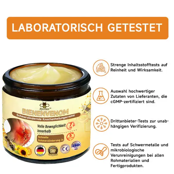 In enger Zusammenarbeit mit führenden Experten im Bereich der Naturheilkunde und Apitherapie haben wir eine revolutionäre Creme entwickelt, die die heilenden Kräfte des natürlichen Bienengifts nutzt, um eine Vielzahl von Beschwerden zu bekämpfen. flysmus™ Bienengift Instant Ultra Strength Schmerzlinderungs-Therapie-Creme ist Ihr Wegbereiter zu einem schmerzfreien, gesünderen Leben, das es Ihnen ermöglicht, Ihre Tage in vollen Zügen zu genießen.