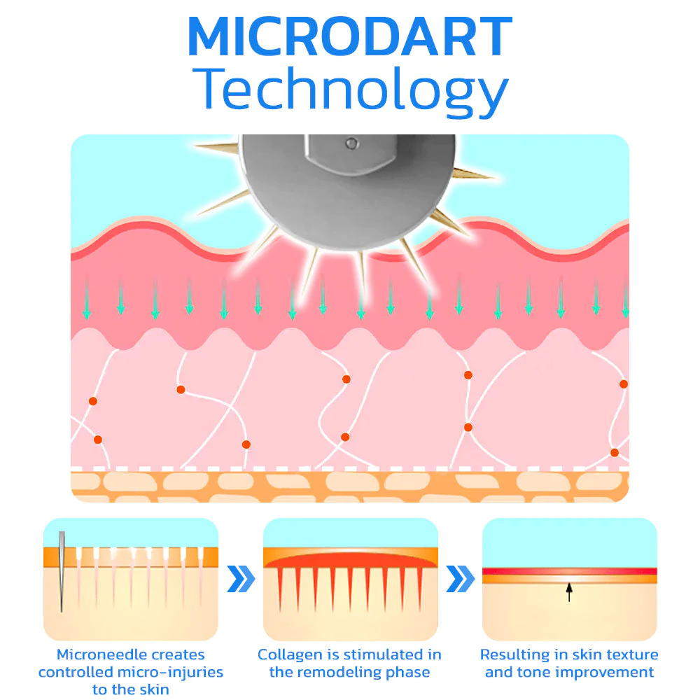 Microdart technology has multiple benefits for the skin. As the micro-needles puncture the skin, they create small channels or microchannels, through which skincare products or active components can penetrate deeper into the skin. This enhances the products’ efficacy, making them more effective in resolving skin problems. Furthermore, it can trigger collagen production, which can help to enhance the skin’s suppleness, minimize the visibility of wrinkles and fine lines, and enhance the overall texture of the skin.