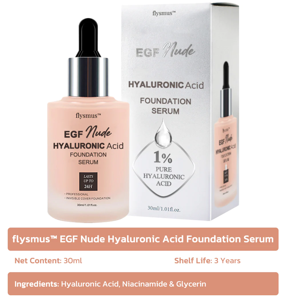 This innovative serum leverages the power of EGF to reduce the appearance of fine lines and wrinkles, while improving overall skin texture and tone. Combined with the hydrating benefits of hyaluronic acid, flysmus™ EGF Nude Hyaluronic Acid Foundation Serum provides a transformative experience, leaving the skin looking youthful, radiant, and revitalized.
