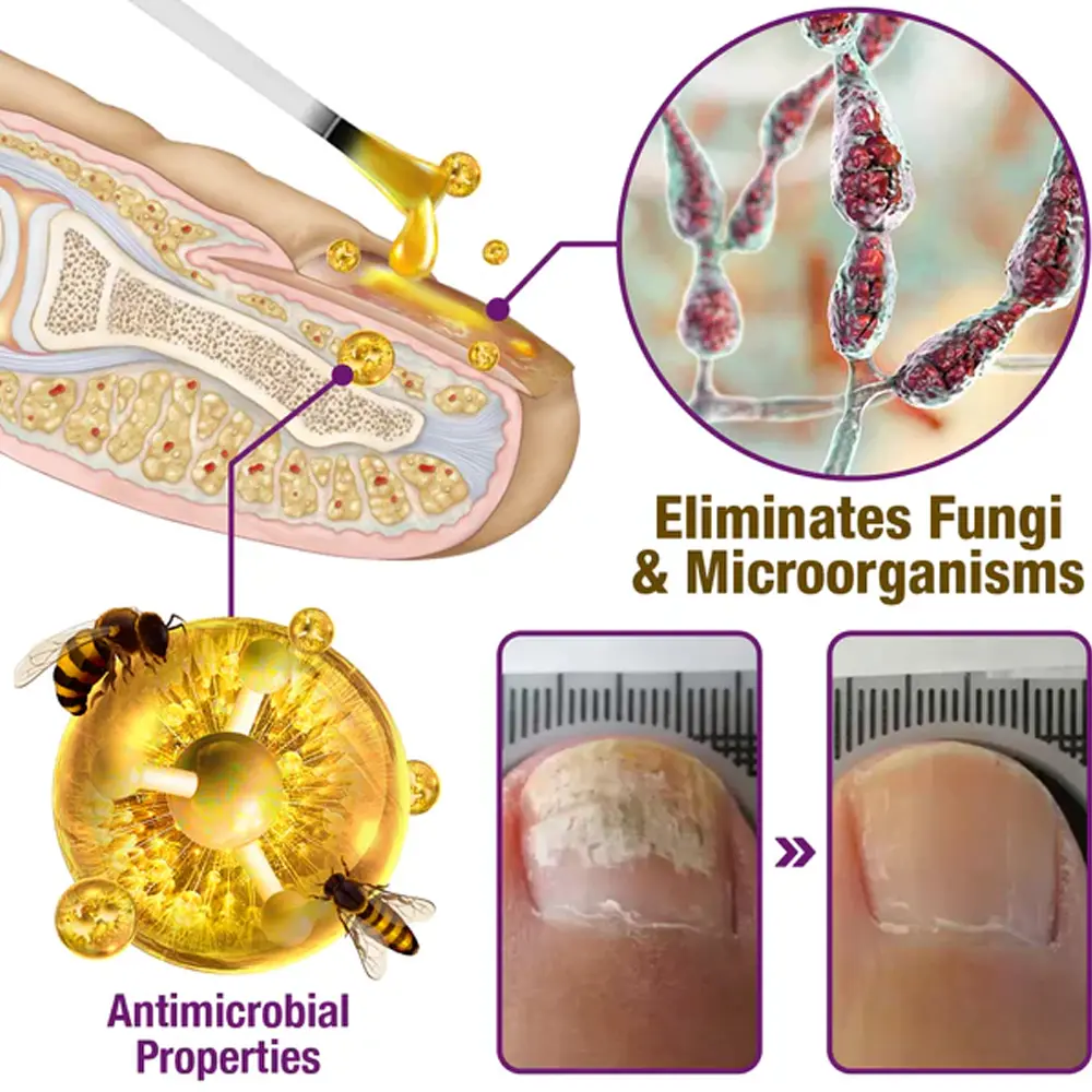 Our specialized formula incorporates antimicrobial agents that effectively combat fungal and bacterial infections, fostering stronger nails that are less susceptible to breakage. Furthermore, bee venom includes anti-inflammatory substances that soothe inflammation in the nail bed, offering protection and promoting long-term prevention of infections.
