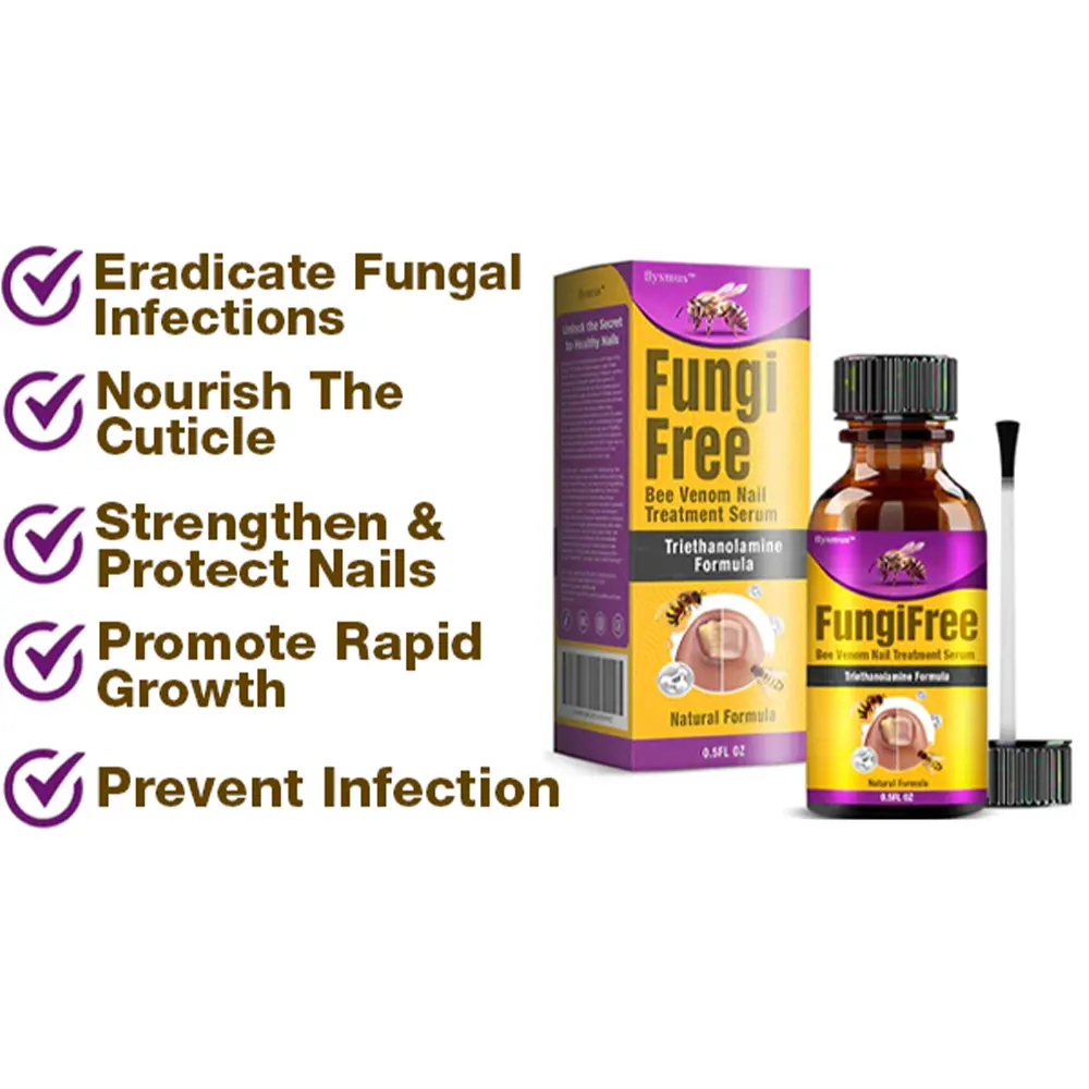 The FungiFree Serum features a potent formula enriched with bee venom, which is loaded with peptides and proteins renowned for their strong antimicrobial properties. These bioactive compounds effectively target and suppress the growth of various microorganisms, including fungi, by disrupting their cellular structures and interfering with their metabolic functions. This ensures a robust defense against nail infections, promoting healthy, fungus-free nails.