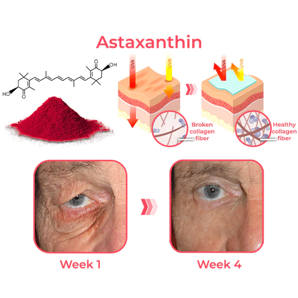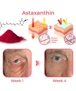 Topical astaxanthin is especially effective when applied beneath the eyes. Its remarkable penetration power complements Retinol’s collagen-stimulating prowess. A single application to the eye area allows Retinol to deeply penetrate the skin’s underlying layers, increasing elastin and doubling its effectiveness in removing sagging and fine lines, resulting in youthful, vibrant-looking skin around the eyes.