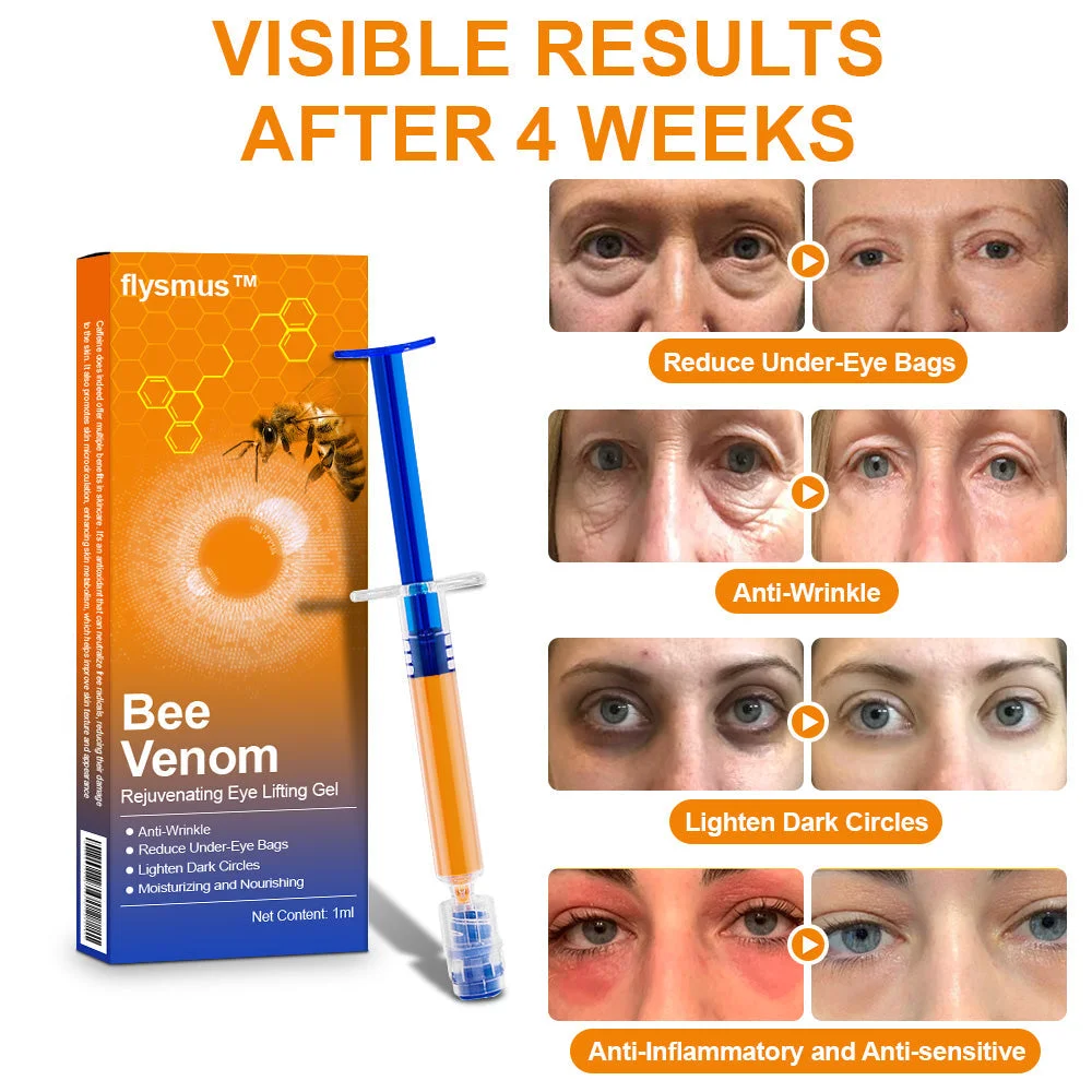 flysmus™ Rejuvenating Bee Venom Eye Lifting Gel for Rejuvenation is a scientifically verified, safe, and effective product specially formulated to address eye contour imperfections. Studies conducted by experts have shown that the natural ingredients of Rejuvenation, including bee venom, contain a variety of bioactive compounds, including bee venom peptide, scientifically proven to effectively firm and repair wrinkles, dark circles, puffiness, and even reduce inflammation around the eyes. This potent formula tones, firms, and defines the skin, reducing fine lines and wrinkles, restoring youthful vitality to your eyes.