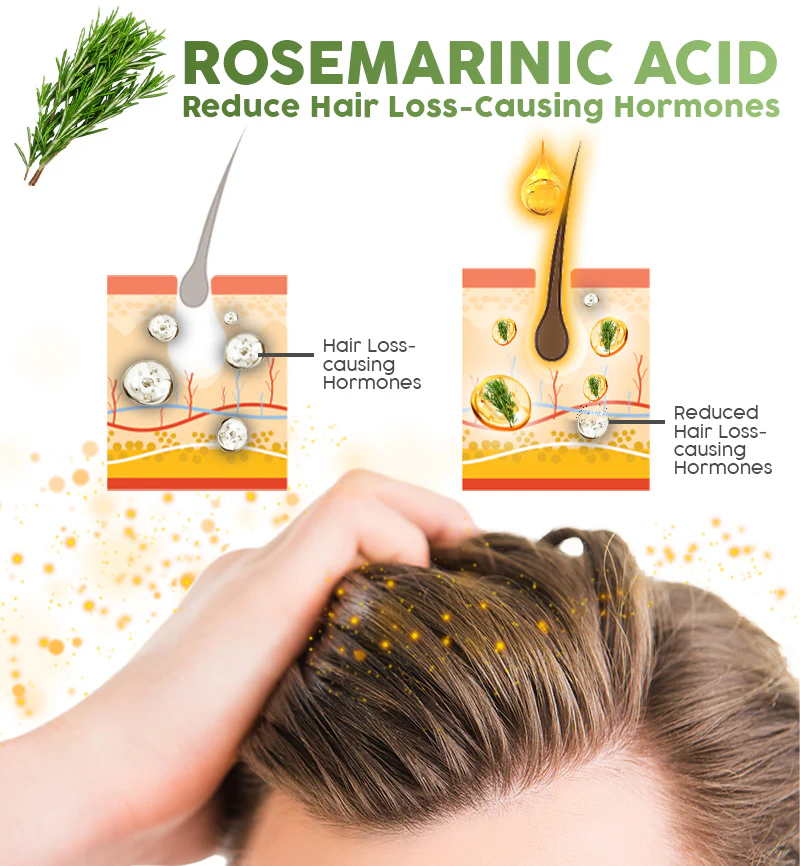 Rosemary contains many dynamic elements that helps boosting overall hair health, volume and density. One of the most prominent ingredient is Rosemarinic Acid. This compound is an essential antioxidant agent. It also helps protect healthy follicles by combating the free radicals and inhibiting the activity of hair loss-inducing hormones. In our 4 weeks clinical research with 30 participants, it is proven to stimulate hair growth by up to 61% when used consistently.
