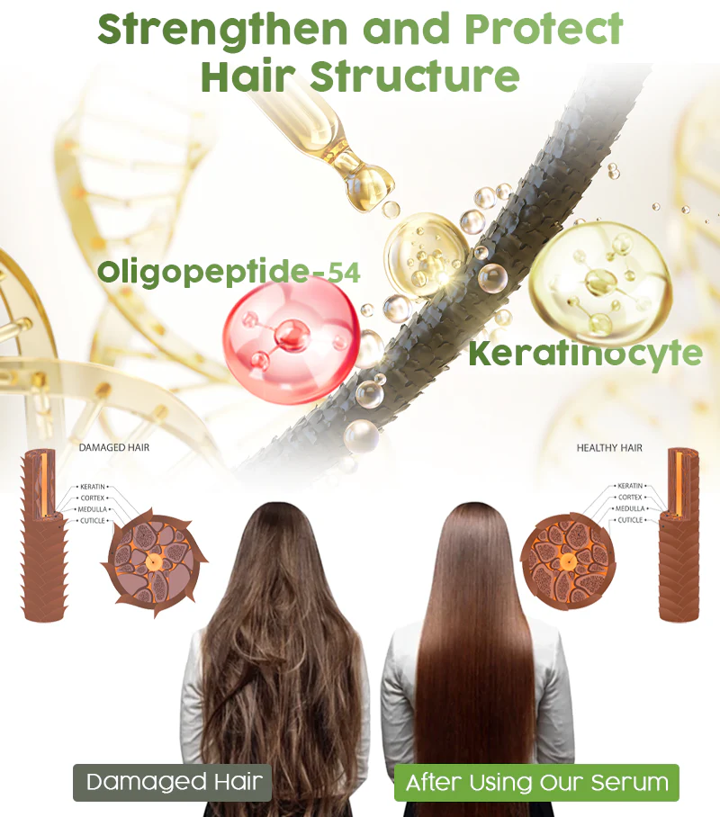 Keratinocyte Peptides help to strengthen hair and improve overall hair vitality. It boosts the natural production of Keratin, which is an essential building block for healthy and strong hair. With Keratinocyte Peptides to help repairing the brittled hair structure, it helps preventing split ends and hair breakage effectively.
