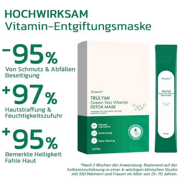 Die flysmus™ TRULYMI Grüntee-Vitamin-Entgiftungsmaske ist eine fortschrittliche Hautpflegelösung, die Schmutz effektiv durchdringt und Schicht für Schicht auflöst, um eine gründliche und revitalisierende Reinigung zu gewährleisten. Die Maske ist mit der natürlichen Kraft des grünen Tees angereichert und enthält essentielle Vitamine. Sie dringt tief in die Haut ein und entfernt gezielt Unreinheiten und Schadstoffe.