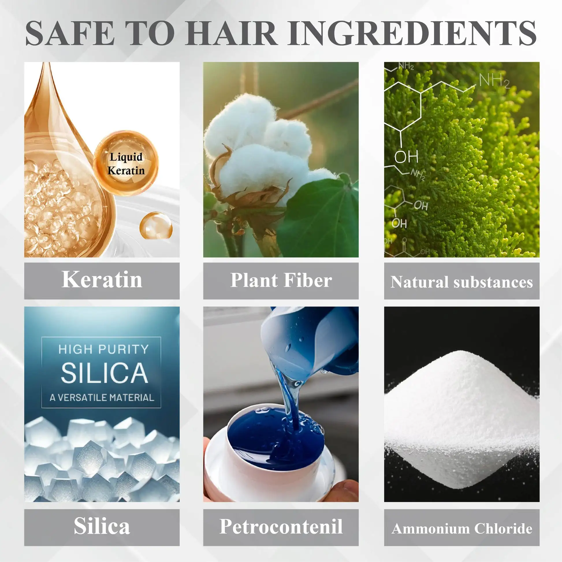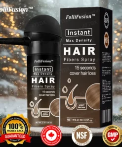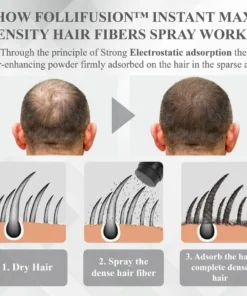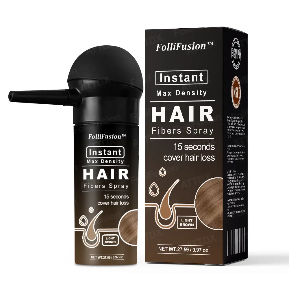 FolliFusion™ Instant Max Density Hair Fibers Spray delivers thick, full, and shiny hair in just 15 seconds. Its strong electrostatic adsorption ensures the fibers stay in place even under bright lights or camera flashes and remaining completely undetectable.