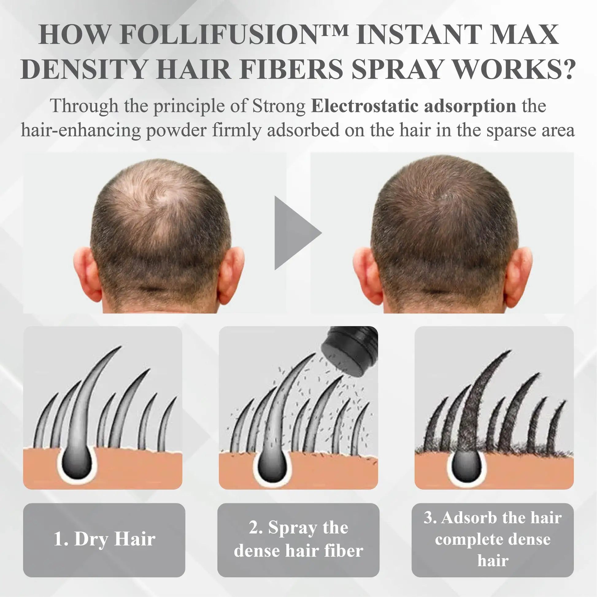 - 1x FolliFusion™ Instant Max Density Hair Fibers Spray (Hair fibers Powder+Spray Applicator)