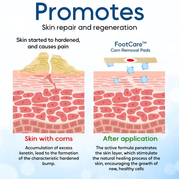 FootCare™ Corn Removal Pads promote healthy skin regeneration. The pads contain components that help to stimulate the natural healing process of the skin, encouraging the growth of new, healthy cells. This aids in the overall reduction of corn size and promotes the restoration of smooth, soft skin.