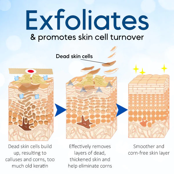 Salicylic acid is a powerful exfoliating agent that helps to break down the thickened, dead skin cells that form corns. It works by softening the corns, making them easier to remove. Salicylic acid also helps to reduce inflammation and promote skin renewal, leading to smoother, healthier feet.
