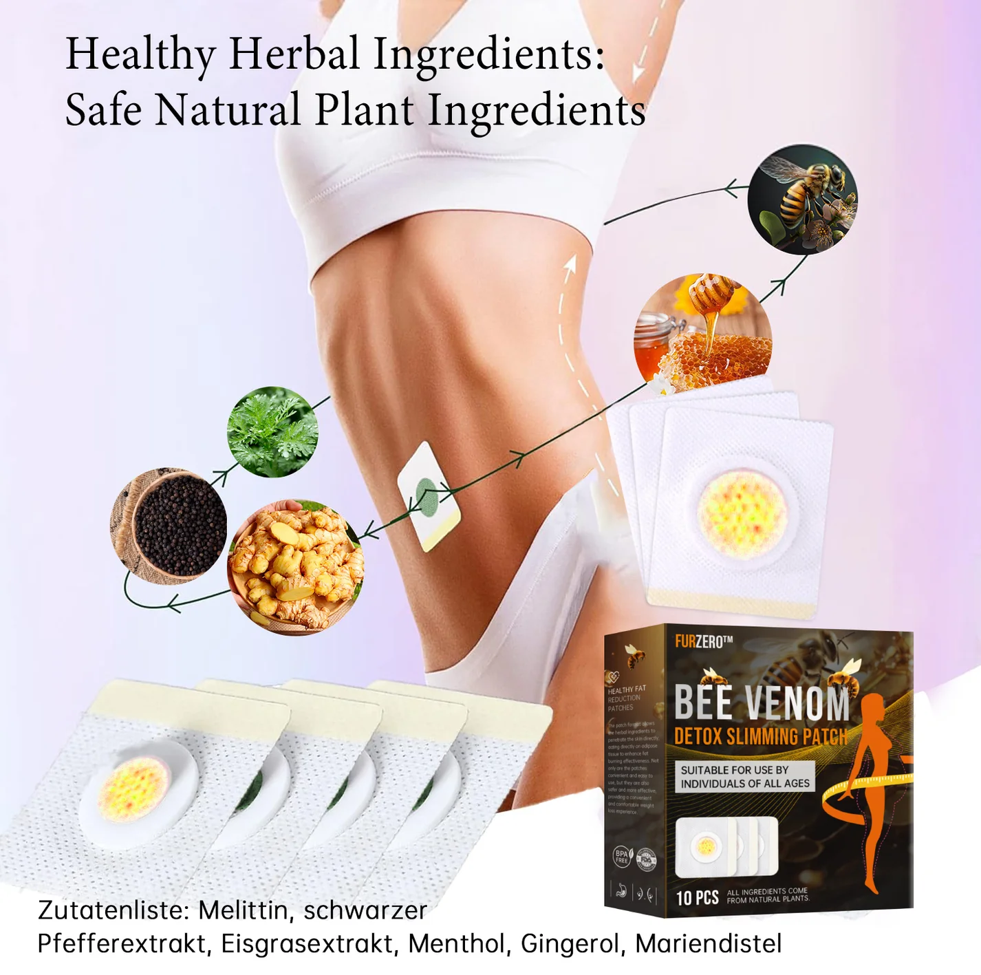Das Verdauungssystem und das Lymphsystem sind lebenswichtige Entgiftungswege im Körper. Aus diesem Grund haben wir das Furzero™ Bienengift Entgiftungs-Schlankheitspflaster entwickelt, das Bienengift und Extrakte aus Eispflanzen sowie vier natürlichen Kräutern enthält. Die hochaktiven Inhaltsstoffe sind konzentriert und in den Seidenmantel des Schlankheitspflasters verkapselt. Während der Anwendung stimuliert der enge Kontakt zwischen dem Bauch und dem Seidenmantel natürlicher Kräuter die Darmperistaltik, was eine schnellere und effektivere Penetration in das Lymphsystem ermöglicht. Durch die Reinigung der Lymphknoten zur Ausscheidung von Abfallstoffen und die Unterstützung der Leberentgiftung und Toxinabsorption verbessert es den Stoffwechsel, führt zu mühelosem Fettabbau und Entzündungsminderung und fördert so einen gesünderen Körper