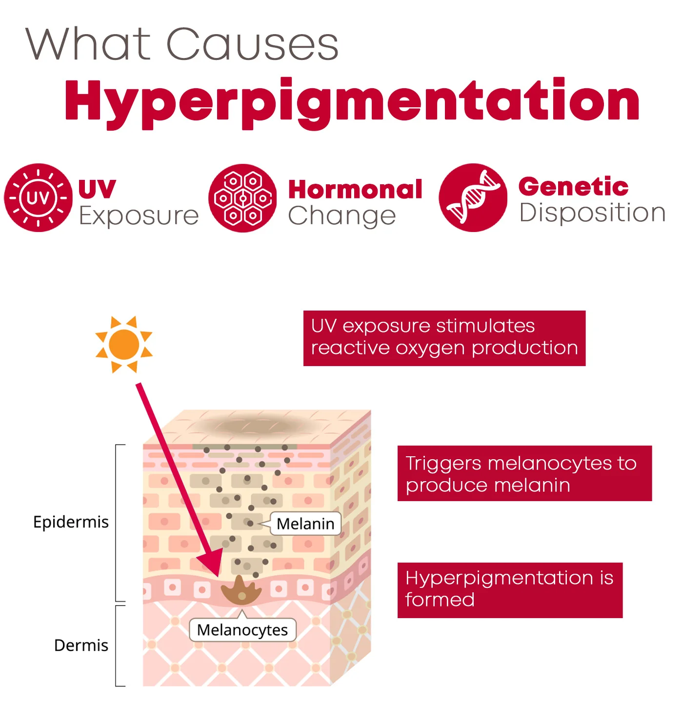 The recurrence of hyperpigmentation stems from various factors, including hormonal fluctuations and genetic predisposition. UV exposure triggers the production of reactive oxygen species, prompting melanocytes to produce excess melanin. When melanin accumulates beyond the skin’s needs, hyperpigmentation results.
