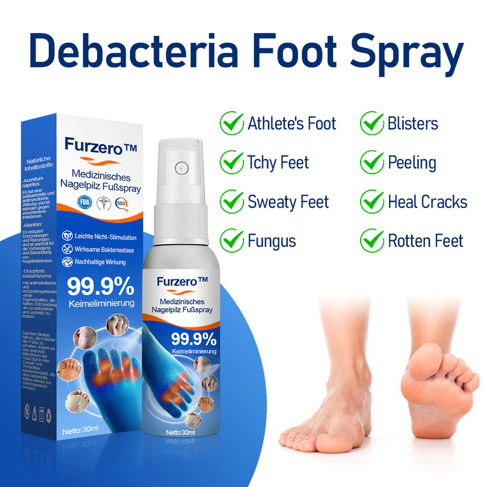 Furzero™ Medizinisches Nagelpilz-Fußspray ist eine wissenschaftlich erprobte, schnell wirkende Lösung für bakterielle Fußerkrankungen. Es hat eine 99%ige Wirksamkeitsbewertung und ist so formuliert, dass es eine Vielzahl von Fußproblemen für eine optimale Fußgesundheit bekämpft. Es tötet Bakterien, Hefe und Schimmel bei Kontakt ab, verschafft sofortige Linderung und beseitigt 99,99 % der Bakterien in weniger als 1 Minute. Das Spray hilft, das pH-Gleichgewicht der Haut zu erhalten, und hält 7 Tage lang. Das Spray enthält ausschließlich natürliche Inhaltsstoffe, die sicher in der Anwendung sind und die Heilung von trockenen, brüchigen Nägeln und geschädigter Haut fördern. Wirksame Behandlung von Pilzinfektionen, grauen Nägeln, Nagelinfektionen, Fußpilz und schlechtem Geruch.