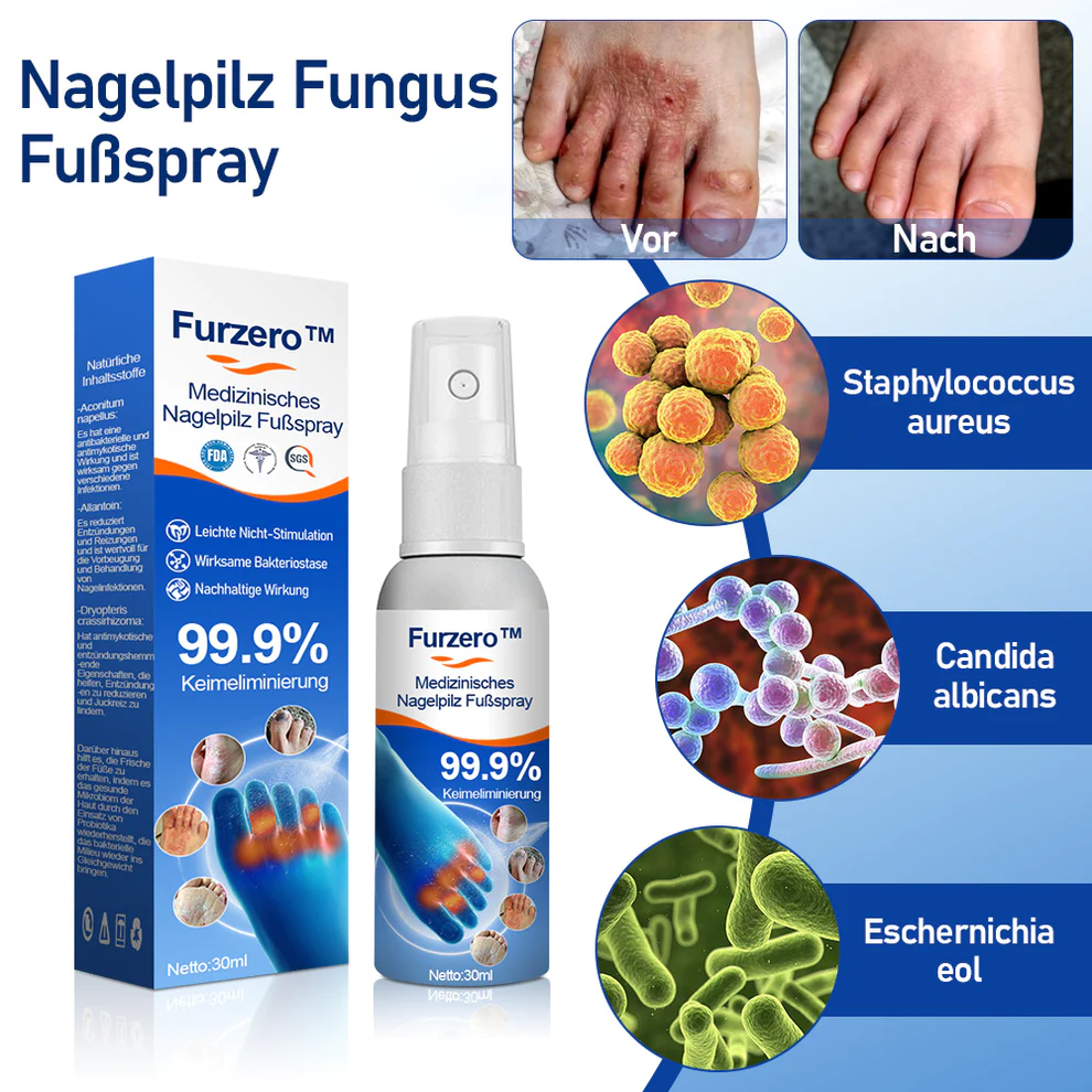 “Ich gehe gerne zur Pediküre ins Nagelstudio und war schockiert, als ich plötzlich merkte, dass mit meinen Füßen etwas nicht stimmte. Meine Zehennägel wurden immer dicker, verfärbten sich und verloren ihr gesundes Aussehen. Entschlossen, eine Lösung zu finden, begann ich, verschiedene rezeptfreie Anti-Pilz-Sprays, Reinigungsmittel und Cremes zu suchen und auszuprobieren, aber ohne Erfolg. Also beschloss ich, meinen Arzt zu konsultieren, der mir das Furzero™ Foot Spray empfahl, das ich dann wie vorgeschrieben verwendete. Halten Sie Ihre Füße trocken und sauber. Nachdem ich es eine Woche lang angewendet hatte, waren meine Fußnägel wieder gesund. Dieses Spray hat die Gesundheit meiner Zehennägel sehr effektiv verbessert”. —- Verheiratet, 32 Jahre alt, Bayern