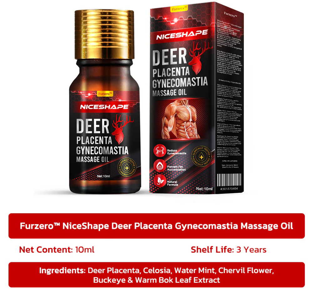 The Furzero™ NiceShape Deer Placenta Gynecomastia Massage Oil utilizes potent ingredients like deer placenta to combat localized fat accumulation, especially in the male breast area. Enriched with bioactive compounds, this oil enhances blood circulation in the targeted area.