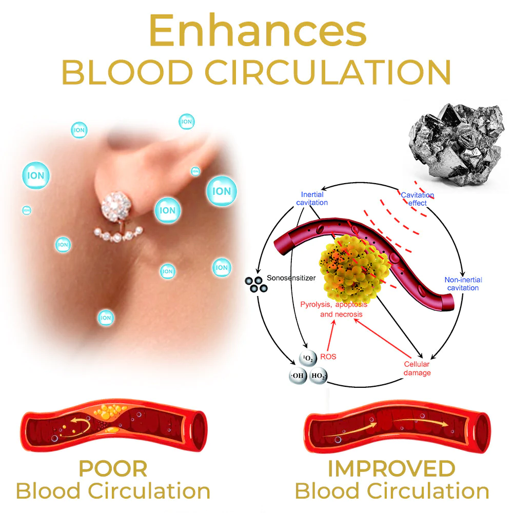Osmium, renowned for its distinctive qualities, releases negative ions that engage with the body’s energy field. When worn, the osmium balls activate acupressure points and meridians in the ear region, encouraging lymphatic drainage and detoxification. Additionally, the negative ions emitted by osmium aid in balancing the body’s energy and improving circulation.