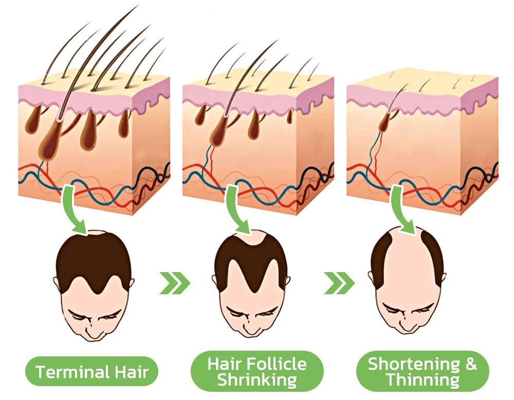 The balding will start in the form of thinning around the temples and the same will slowly progress towards the back of the head. Eventually, there will be a bald patch on the top of the head. The condition is often genetic and the hair follicles are often sensitive to dihydrotestosterone or DHT. The falling out of hair will be gradual and the chances of new hair growing will be minimal.