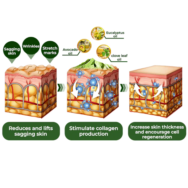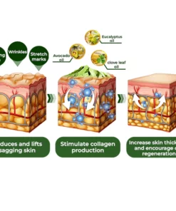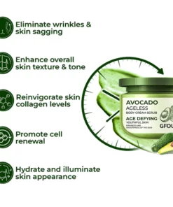 GFOUK™️ Avocado Ageless Body Cream Scrub reduces and lifts sagging on the skin through its combination of key ingredients. Avocado oil, eucalyptus oil and clove leaf oil stimulate collagen production, increase skin thickness and encourage cell regeneration, ultimately diminishing the appearance of wrinkles and sagging. The cream’s biochemistry replenishes collagen diminishing sagging and wrinkles while also replenishing hydration, making skin look supple and youthful.