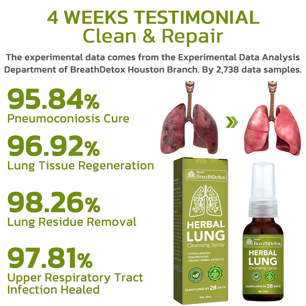 In einer umfassenden weltweiten klinischen Studie mit 2.738 Teilnehmern über einen Zeitraum von 28 Tagen zeigte das GFOUK™️ BreathDetox Kräuter-Lungenreinigungsspray eine bemerkenswerte Wirksamkeit bei der Reinigung und Revitalisierung der Lungen von Personen, die in der Vergangenheit längere Zeit geraucht oder Staub ausgesetzt waren. Die Teilnehmer erfuhren eine bemerkenswerte Verbesserung ihrer Symptome wie Husten, Kurzatmigkeit, Schleimproduktion, Brustschmerzen und Atembeschwerden.